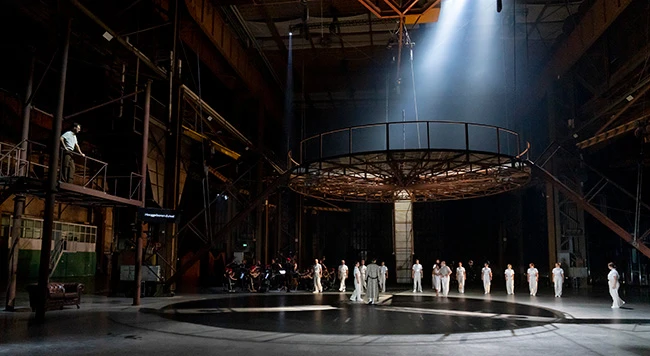 Het is een indrukwekkend spektakel geworden in de geweldig mooie ruimte van de Werkspoorkathedraal. De deftige graaf (Marcel van Dieren) en de charmante Figaro (Joris van Baar) zijn nu plotseling berooide vluchtelingen zonder papieren die zich in steenkoolengels moeten legitimeren tegenover onverschillige grenswachten. Dat is behoorlijk aangrijpend en actueel'