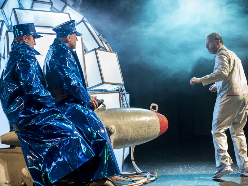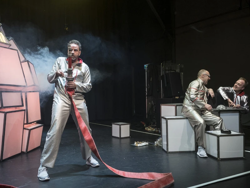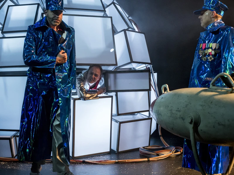 (...) Regisseur Bram Jansen en choreograaf Ryan Djojokarso maken optimaal gebruik van het decor van Douwe Hibma en slagen er daadwerkelijk in zeker het jeugdige publiek niet te laten zien dat zowel de rollen van de uitvinders als die van de soldaten gespeeld worden door dezelfde drie zangers: Marcel van Dieren, Niek Idelenburg en Erik Slik. De zangers ogen en klinken niet alleen anders in hun dubbelrollen, ze bewegen ook totaal anders. Hun bewegingen worden nog grotesker door het terugkerende ridderthema uit Prokofjefs ‘Romeo & Julia’ dat door componist Roel Slootman is gearrangeerd voor slagwerk en behendig wordt vermengd met zijn eigen soundscape.